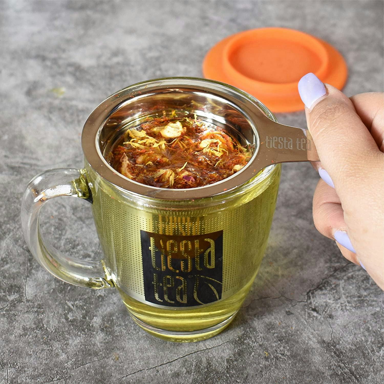 This stainless steel tea diffuser has a genius basket design that sits right on top of your mug, so you won’t have to deal with a hanging diffuser falling to the bottom. This mess-free basket also comes with a little silicone drip tray to sit the basket on when your tea is ready.