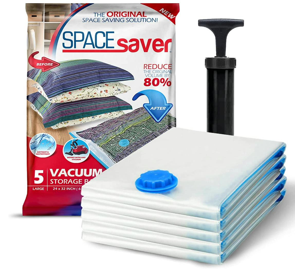 With this space-saving vacuum storage bag set, you get five large bags, each with its own hand pump for compression. The clear design lets you see what’s inside without opening anything. The double-seal zip keeps air out, and the bags themselves are thick enough to avoid accidental punctures. Whether it’s bedding, blankets, or clothes, the bags compress down to a fraction of the original size.