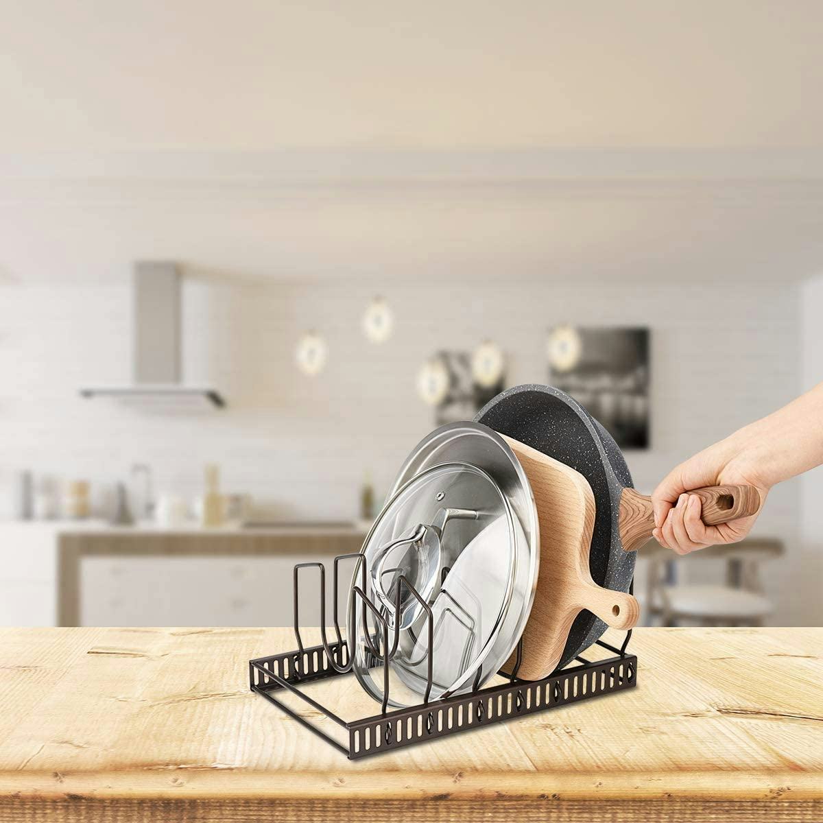 You’re looking at a metal pot lid organizer designed with seven adjustable compartments that slide along the frame to create custom spacing. The rack features seven dividers and a low-profile base sized for cabinets or countertops. The coated finish helps protect the metal from moisture, while the vertical design supports lids, pans, and bakeware in an upright position.