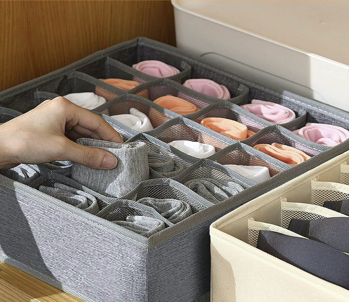 Three fabric boxes come in this drawer organizer set with a total of 64 individual cells, each sized for socks, underwear, or ties. The soft fabric keeps the boxes lightweight, while reinforced edges help them hold their shape inside a dresser or closet shelf. The organizers, which are backed by over 14,000 five-star reviews, fold flat when not in use, so storage doesn’t turn into another storage problem.