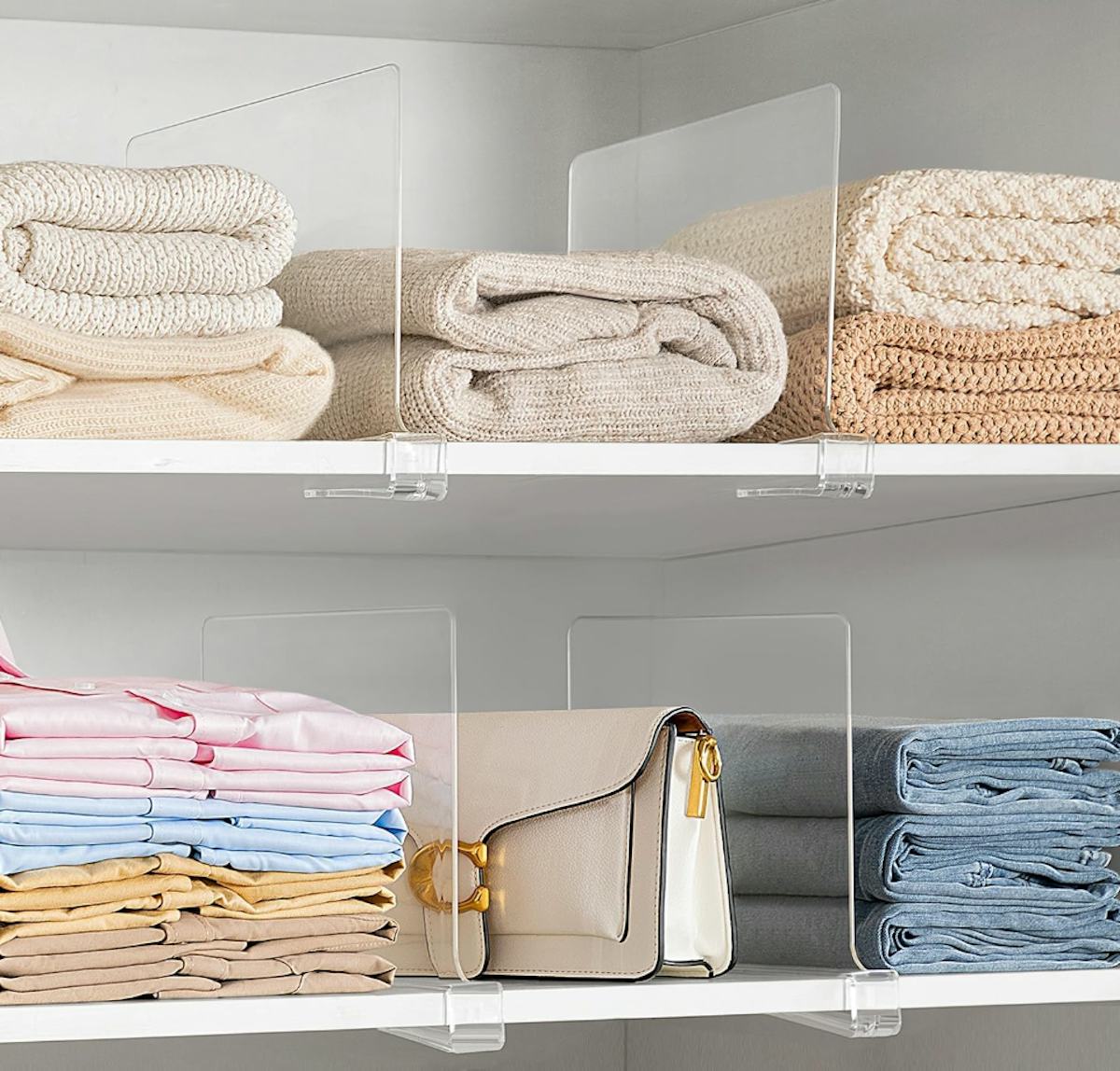 Organize your purses with this purse divider, which is built with four adjustable spacers that leave room for customization. Aside from purses, it’s also great to store books, towels, dishes, toiletries, or anything else of various widths. Because it’s made from transparent acrylic, it’s a barely-there addition to any shelf. If you prefer, you can also buy this divider in a pack of two.