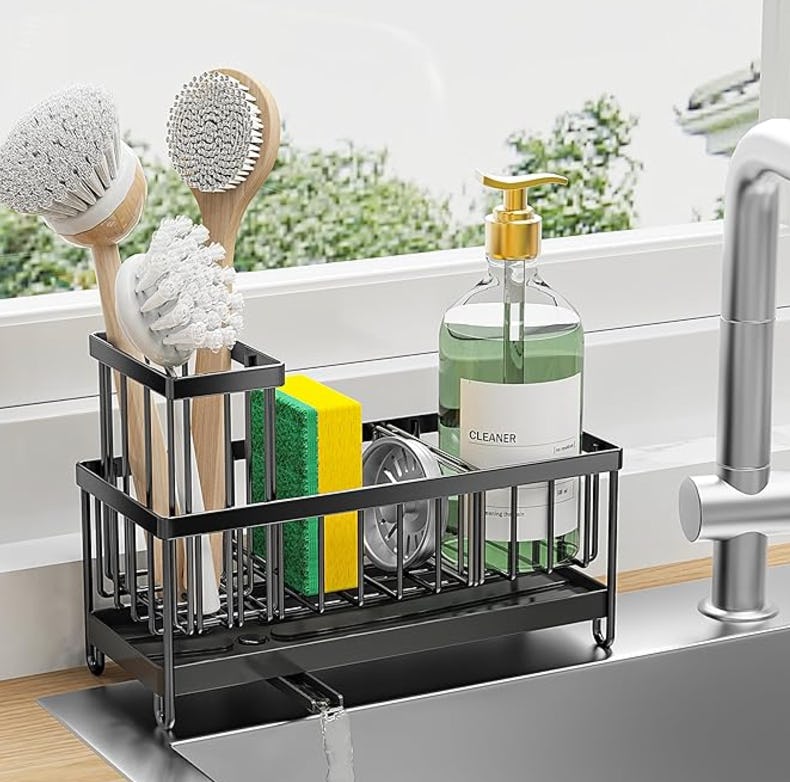 A stainless steel sink caddy & soap organizer that keeps counters clean