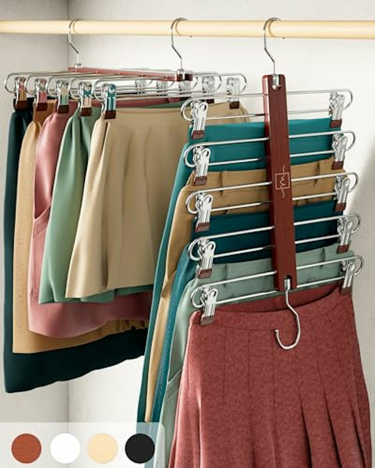 Each of these skirt hangers is made from European beechwood (the real deal), with five evenly spaced tiers and smooth metal clips that slide where you need them. The hangers come in a two-pack, and there are 360-degree swivel hooks on each hanger, so they can be hung vertically or horizontally. Choose from four hanger colors.
