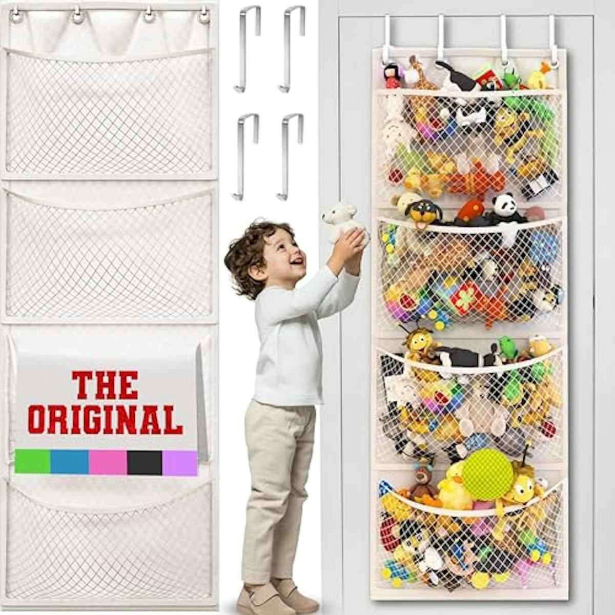 A stuffed animal storage organizer with an over-the-door design