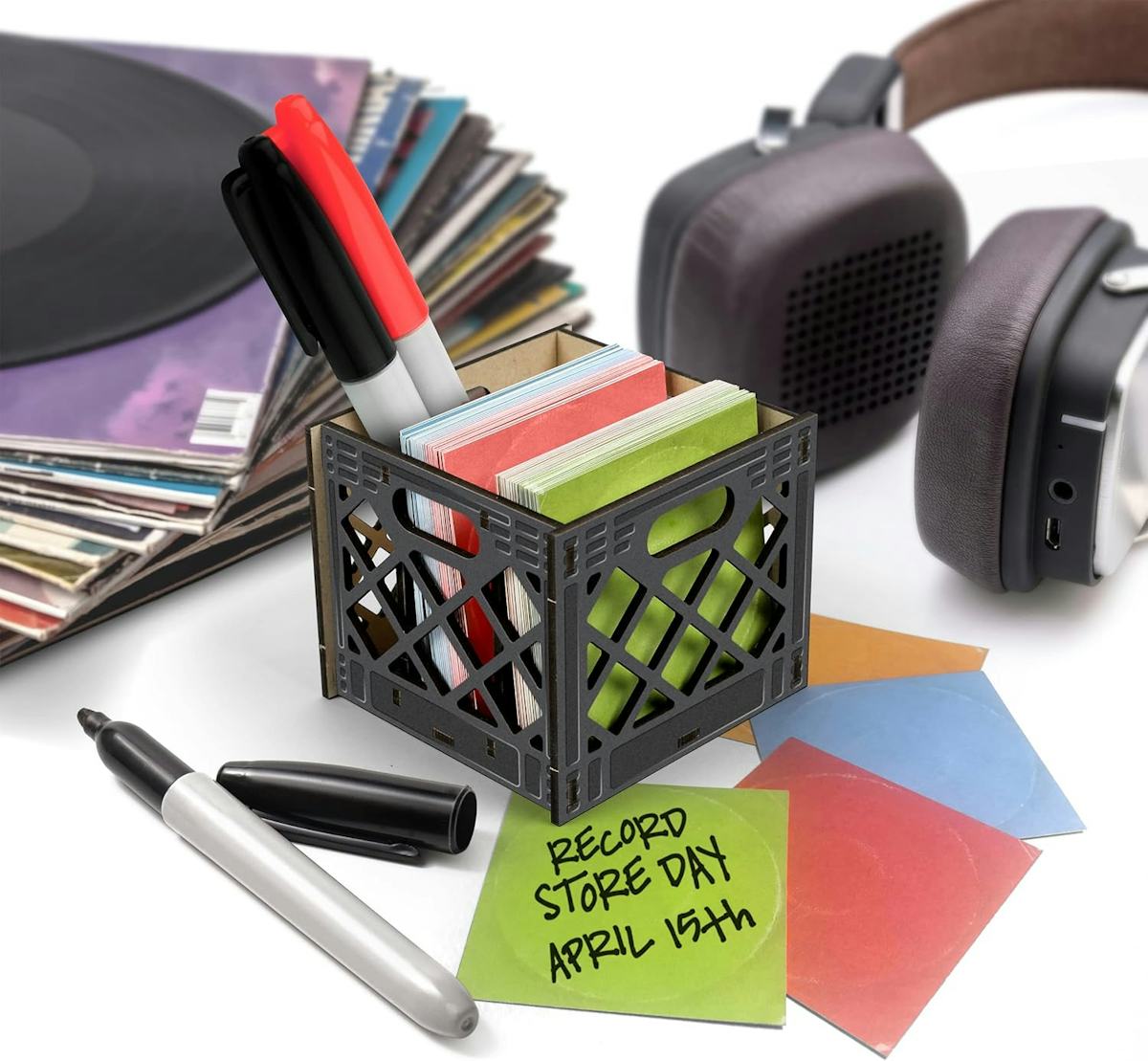 A vinyl-inspired milk crate notecard holder with record-store vibes