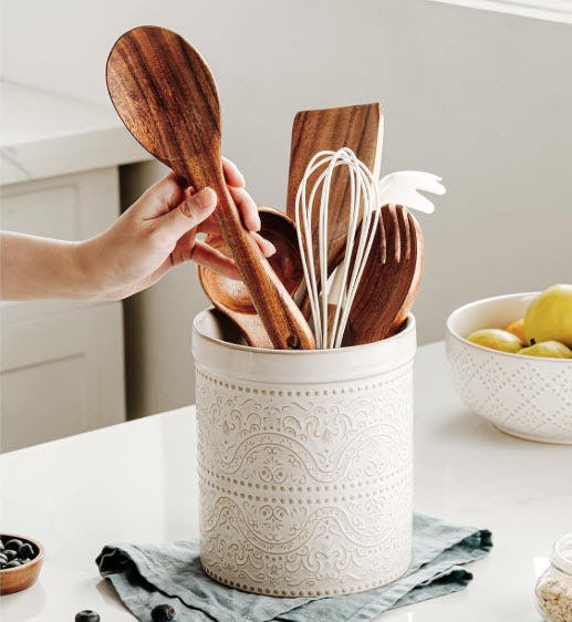 This rustic kitchen utensil holder brings charm to your countertop with its 7-inch-tall ceramic design and intricate lace embossing. The wide opening makes it easy to organize spatulas, whisks, and spoons without crowding. It stands out as both functional and decorative, giving your kitchen a touch of elegance.