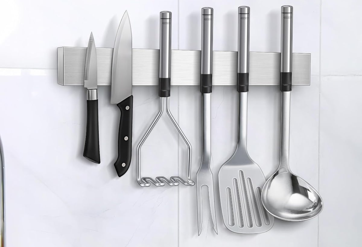 You can line up all your knives without cluttering drawers thanks to this magnetic strip. The metal bar holds a variety of knives, from chef’s favorites to smaller paring tools, and even doubles as a spot for kitchen utensils if you’re feeling resourceful. It mounts on walls or your fridge, giving you options for tight kitchens, and has earned an overall score of 4.6 stars.
