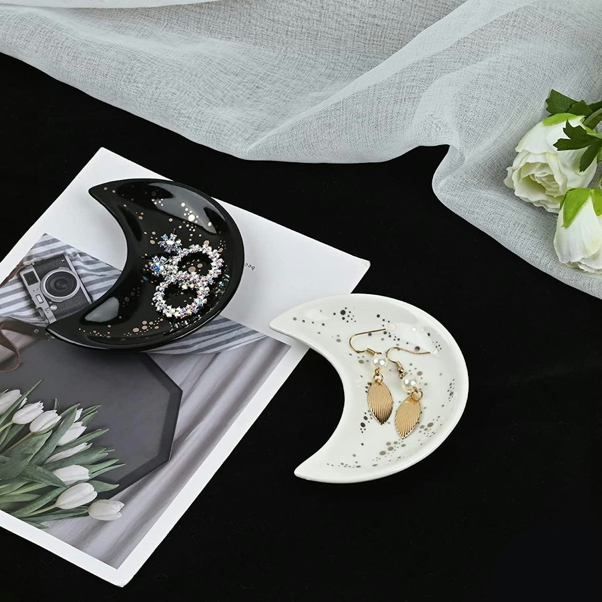These small moon jewelry dish trays come in a pair, each one a tiny ceramic crescent perfect for holding rings, earrings, or loose trinkets. Its modern, minimal design is cute and fun while brightening your space. The white and black trays, which have earned an overall score of 4.7 stars, are great for displaying together or apart in different spaces.