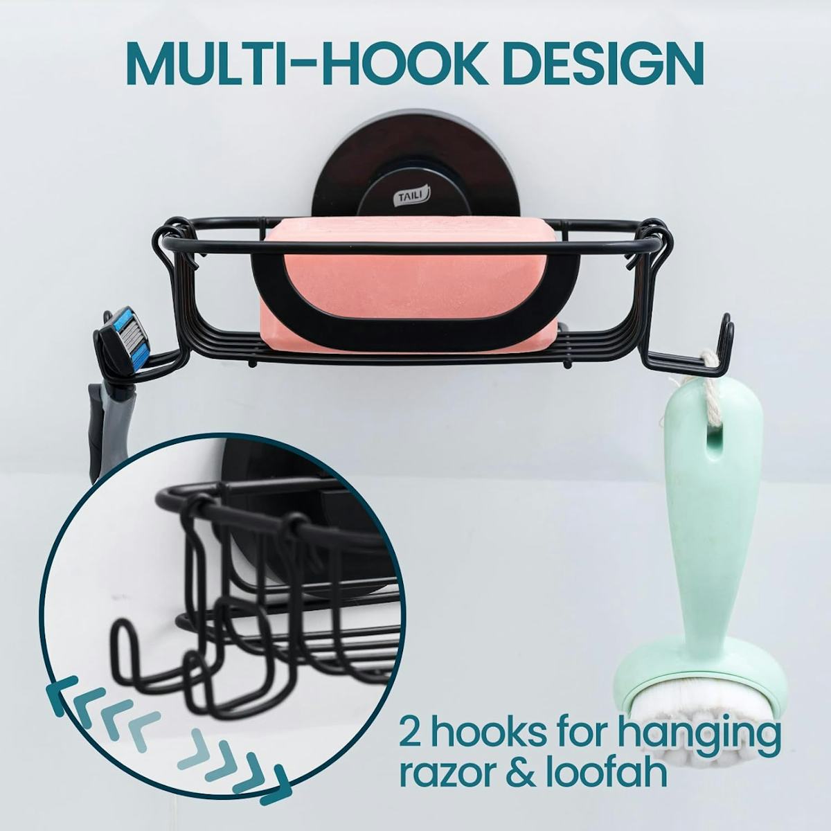 This soap bar holder dish is more than just a soap holder. It mounts to the wall with a suction cup, holding soap up and out of the way while keeping a razor handy. Made of rustproof stainless steel, it’s designed for wet spaces like showers and sinks. Hooks add extra storage options, and the black finish gives it a modern look.
