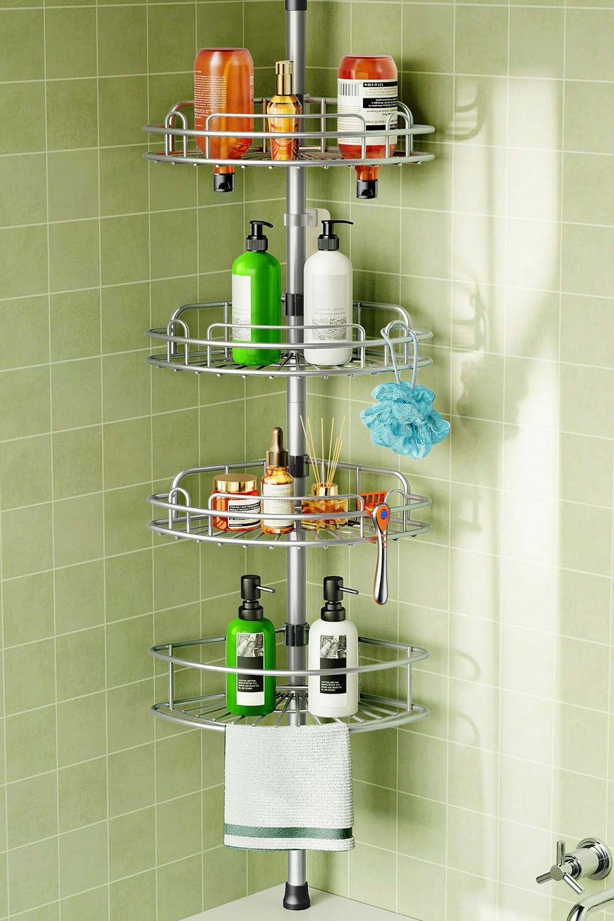 If your shower needs some extra storage space, check out this rust-resistant corner shower caddy. The caddy stretches from 47 to 121 inches, making it easy to fit in tight corners or taller shower spaces. Four tiers give you plenty of spots for bottles, soap, and loofahs, while the tension pole design means no drilling is required.