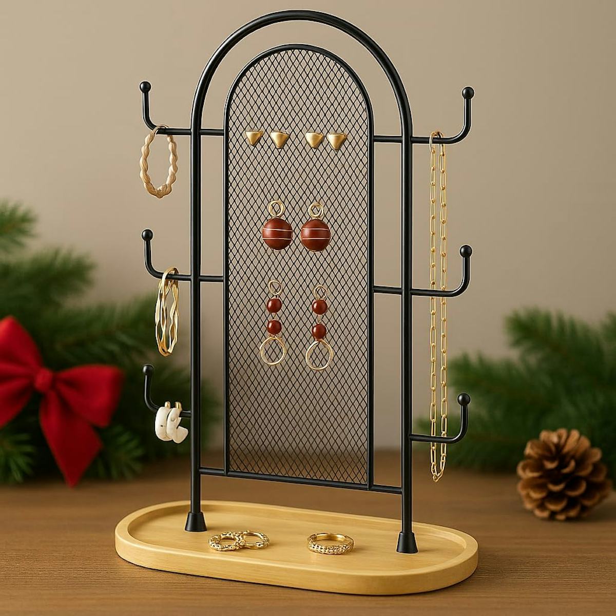 With six hooks, 300 stud holes, and a wood tray for rings, necklaces, and bracelets, this jewelry holder organizer is basically a small jewelry department in one compact tower. Earrings, chains, and bangles each have their own spot, which makes finding your favorite pieces way easier. You can choose from black or gold-painted metal.