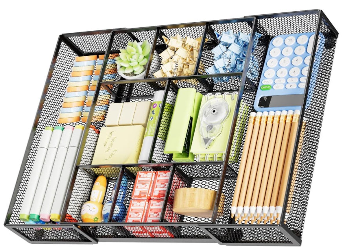 This expandable desk drawer organizer fits into drawers that range from narrow to wider widths with its two sliding extension compartments. The mesh tray comes with five removable dividers that let you tailor up to 10 spaces for different things in one tray. The powder‑coated metal frame resists corrosion and keeps its shape, while nonskid feet help it stay put. “Perfect for decluttering and organizing. Will likely outlast the desk or cabinets you are organizing,” one reviewer wrote.