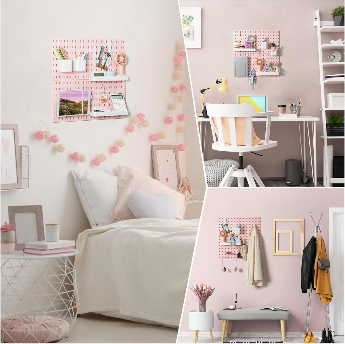 This pegboard combination wall organizer kit is 22 by 22 inches with a generous lineup of 17 accessories, all designed to mix and match. It includes shelves, cups, hooks in multiple shapes, and a letter holder, giving you plenty of layout options right out of the box. The panels are designed to connect, so the grid can be arranged as one larger square or spaced out.