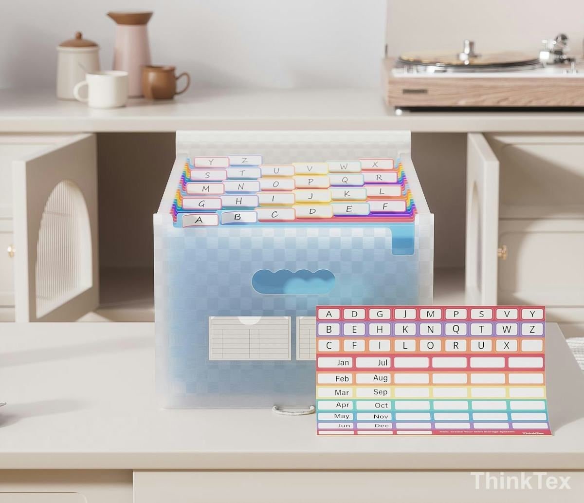 An accordion file organizer with 26 pockets & colorful A to Z tabs