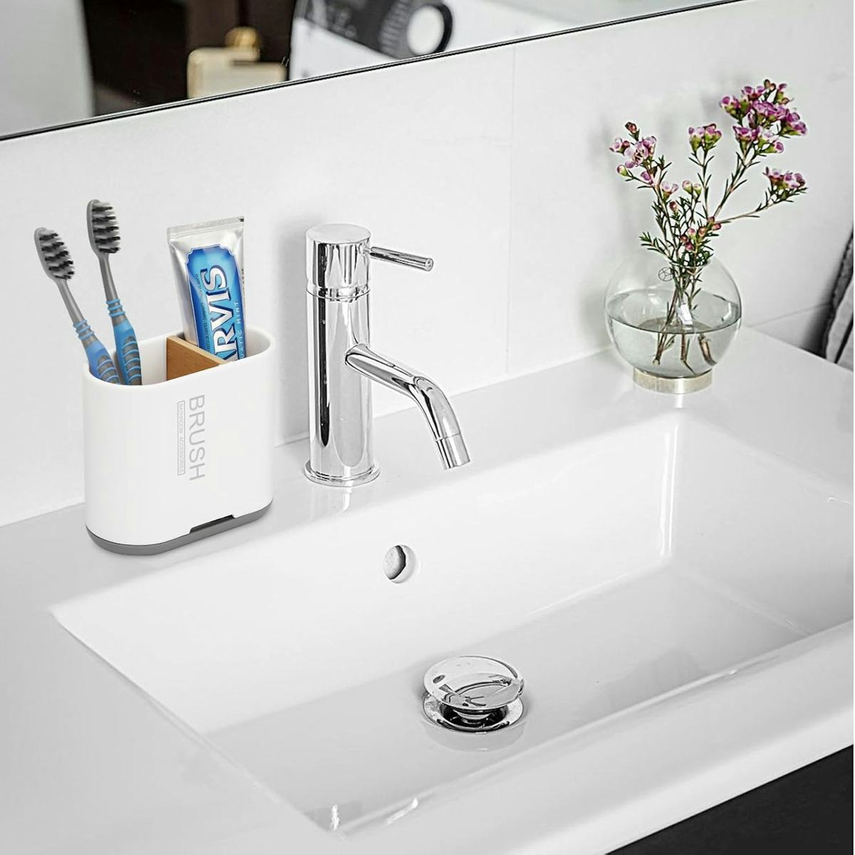 This bamboo toothbrush and toothpaste holder is all about keeping your bathroom counter organized without taking up much space. It has two slots for electric or manual toothbrushes, plus room for your toothpaste, and the bamboo divider keeps everything separated. The holder detaches easily for cleaning, and the drainage system lets water escape so nothing pools at the bottom.