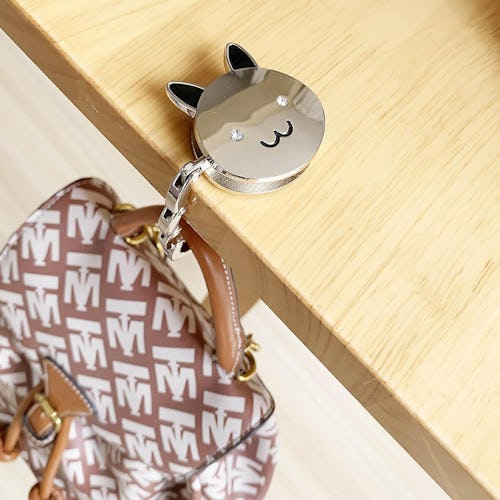 A kitten-shaped purse hook that holds your bag off the floor at a restaurant or bar