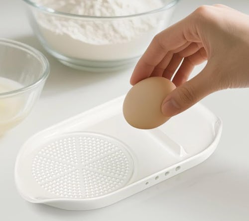 A ceramic spoon rest that doubles as a garlic grater & egg cracker