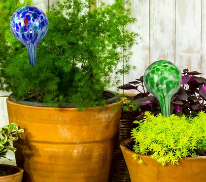 Colorful watering globes that help keep plants hydrated