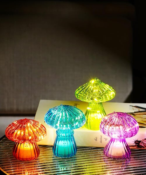 Add a touch of whimsy to your nightstand with these colored glass mushroom lamps