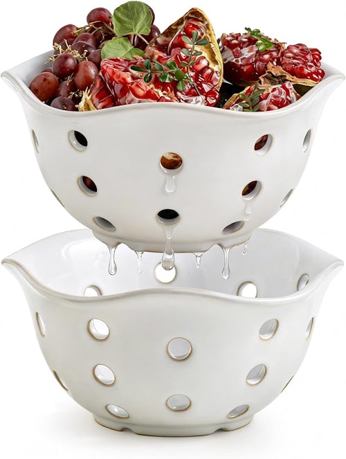 These ceramic colanders are more bougie than plastic versions. They feature 25 drain holes so you can wash fruit and allow them to air dry. They’re aesthetic enough to leave on your counter and since they allow air flow, they can help produce last longer. They’re safe to use in the fridge, freezer, oven, and dishwasher.
