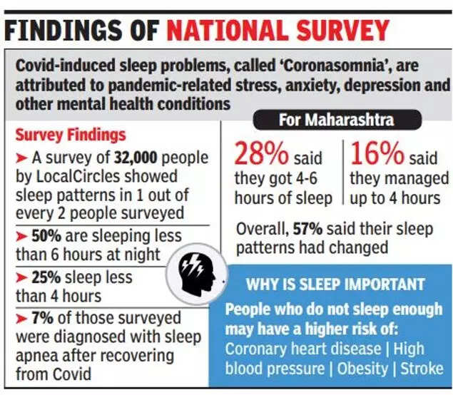 MUMBAI: Almost six out of 10 people who suffered from Covid in Maharashtra said their sleep patterns have been disrupted since their recovery, according to a survey. Almost 16% of those surveyed in the state said they could only sleep for less than four hours a night. A healthy sleep duration would be between 7-8 hours a night, but the national survey found 50% of those interviewed slept less than 6 hours at night.