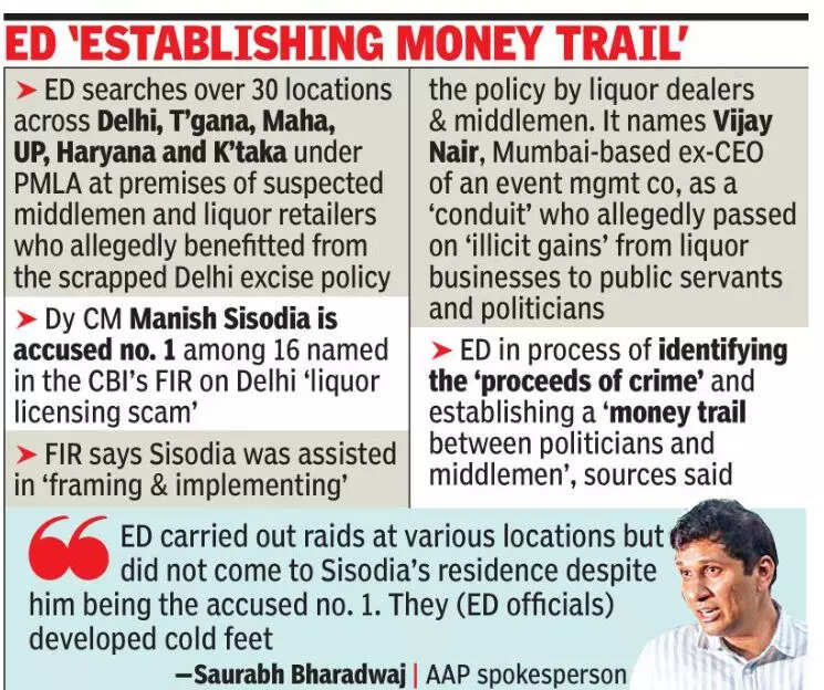NEW DELHI: Initiating a money laundering probe in the Delhi excise scam in which CBI has named deputy CM Manish Sisodia in its FIR, the Enforcement Directorate on Tuesday carried out searches at more than 30 locations across Delhi, Telangana, Maharashtra, UP, Haryana and Karnataka at the premises of suspected middlemen and liquor retailers who were alleged beneficiaries of the now-scrapped excise policy.