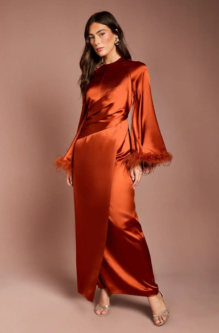 Coast Feather Trim Satin Maxi Dress, £129, Warehouse