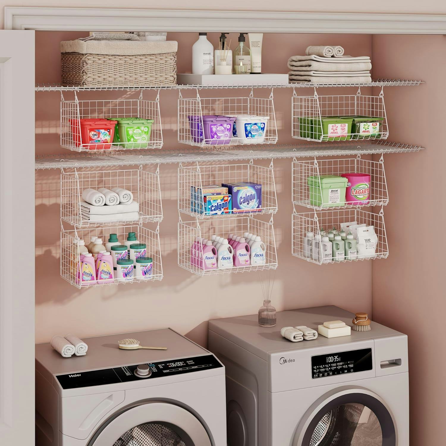 These hanging baskets are designed to attach to wire shelving or racks. You can hang them individually or attach them to each other. They have rotating hooks so you can adjust the angle easily. Plus, they have a raised edge to keep items secure. They’re perfect for your pantry, laundry room, or closet.