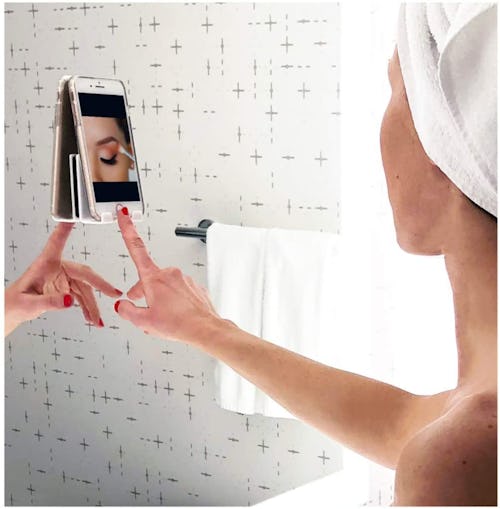 This phone mount can support up to 2 pounds and can hold just about any device from tablets to phones in portrait or landscape orientation, and it features a slot that allows a device to be charged while it’s in the holder. It’s easy to install with a special backing that has thousands of nano-sized suction cups. It can be repositioned and removed without leaving behind any residue on any glass or mirror surface.