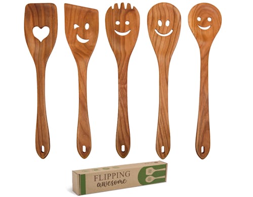 These wooden cooking spoons are practical and fun kitchen utensils you’ll find yourself reaching for often. They’re made of solid cherry wood so they’re lightweight yet durable. They’re perfect for mixing, scraping, stirring, and more and won’t scratch or damage your pots or pans. This set includes five spoons in different styles with cutout smiley faces and one with a heart.