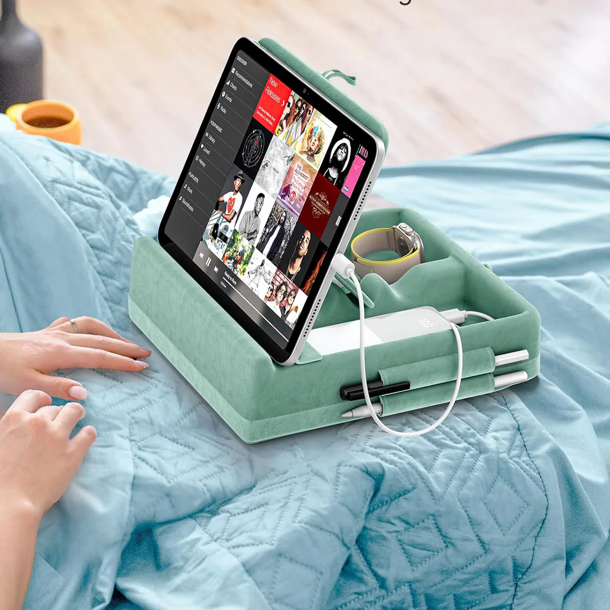 A soft tablet stand with adjustable heights & storage