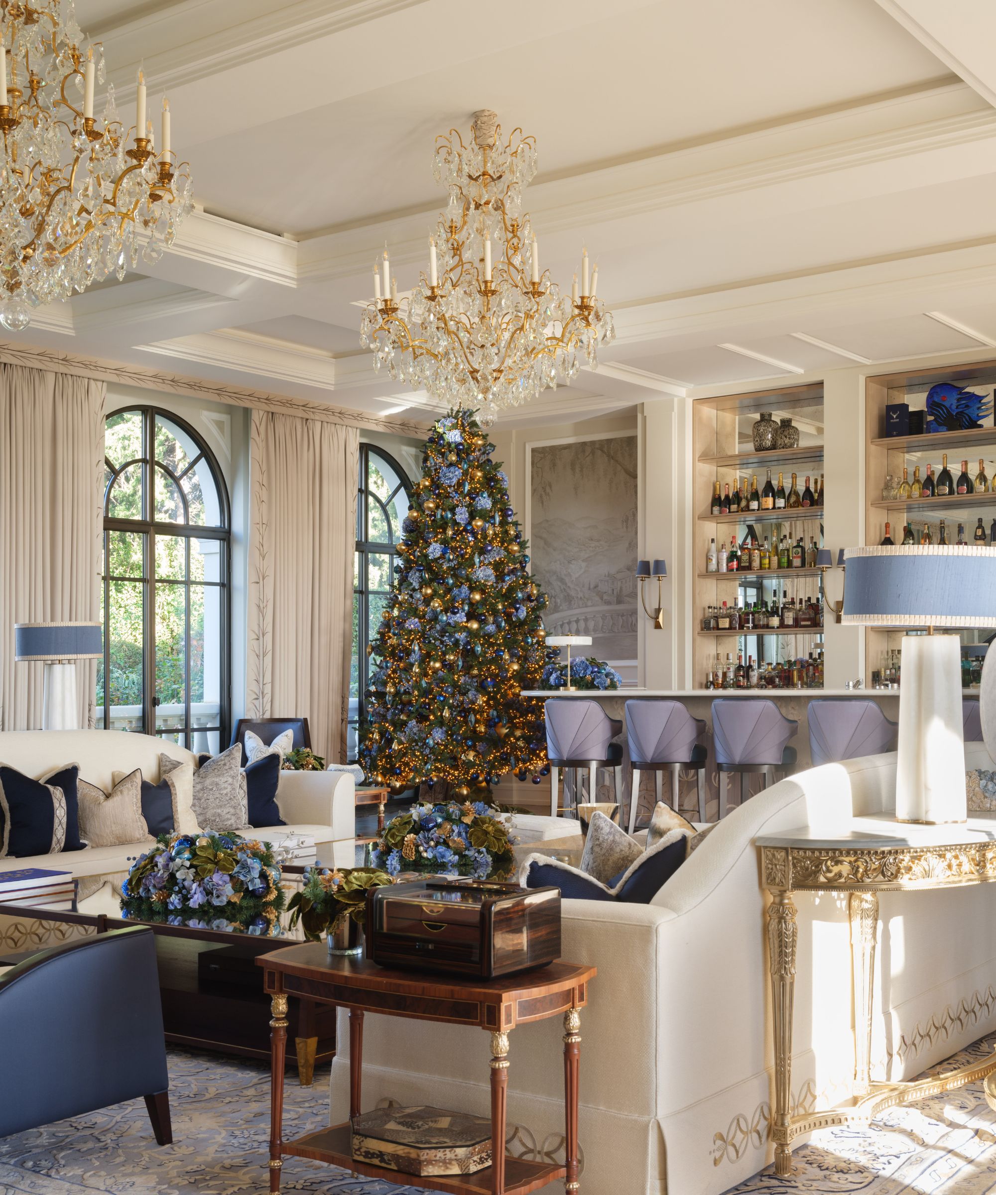 She continues: 'We had that tree decorated in blue to match the blue hues of the Ballroom; everything was thoughtfully considered there. The client wishes for a whimsical, idyllic Christmas scene, so we looked to The Four Seasons and The Ritz, Claridge's, and the Rockefeller tree for more inspiration.'