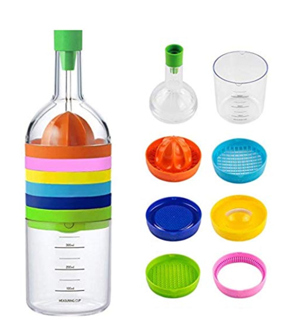 Whether you need to measure out 100 milliliters of oil or grate a block of cheese, this kitchen tool has you covered. It combines eight tools into one, including a measuring cup, juicer, cheese grater, strainer, egg separator, and more. And since each tool slides onto the bottle, keeping them all together in storage is no trouble at all.
