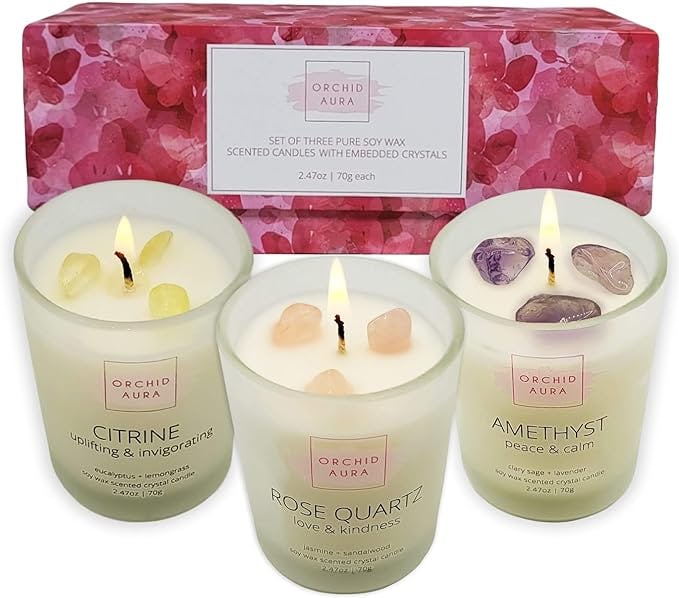 These soy candles embedded with healing crystals