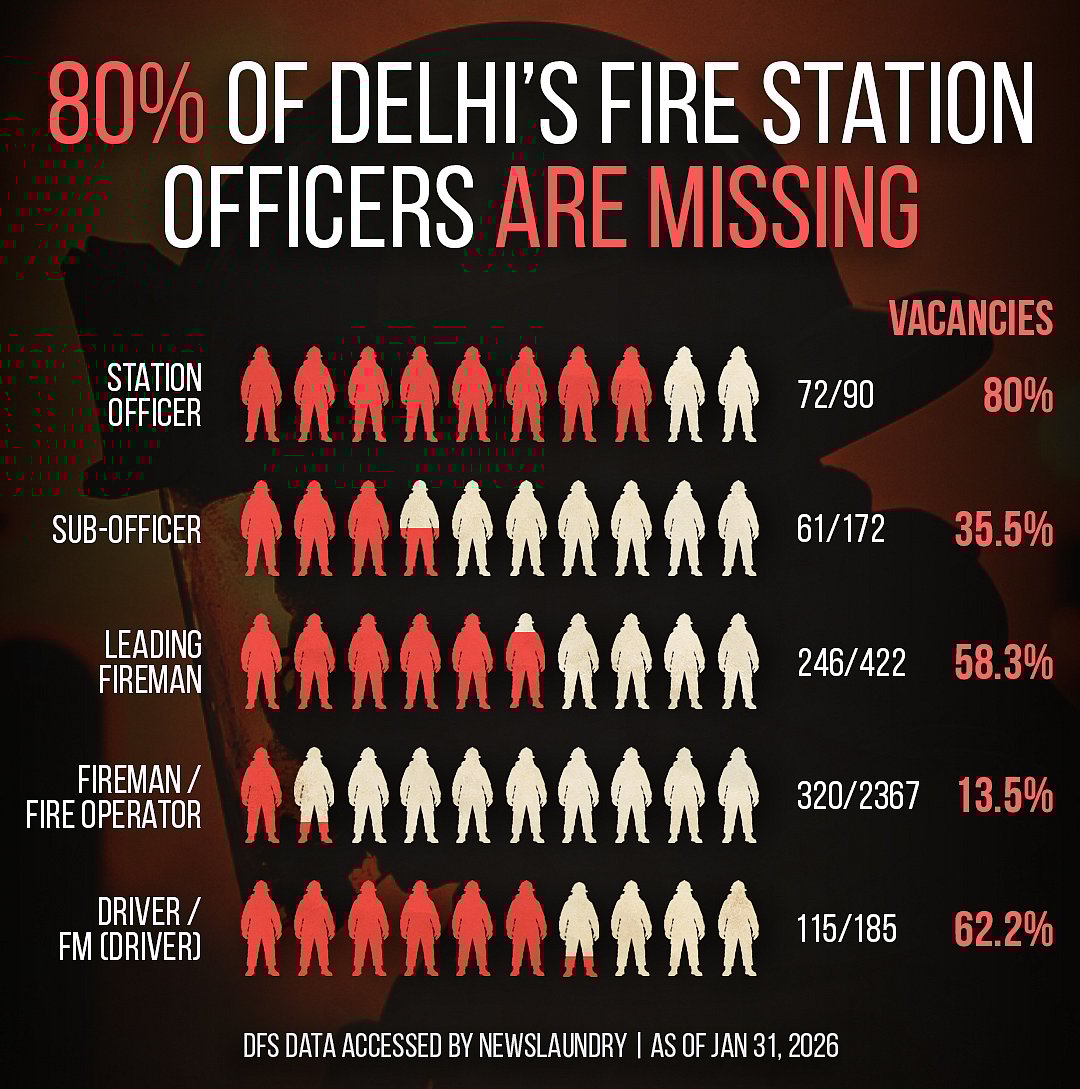 In Delhi, vacancies are severe across the operational command centre. As of January 31, nearly 80 percent of station officer posts – the officers who head fire stations – are vacant. More than half the posts for leading firemen and drivers are also unfilled.