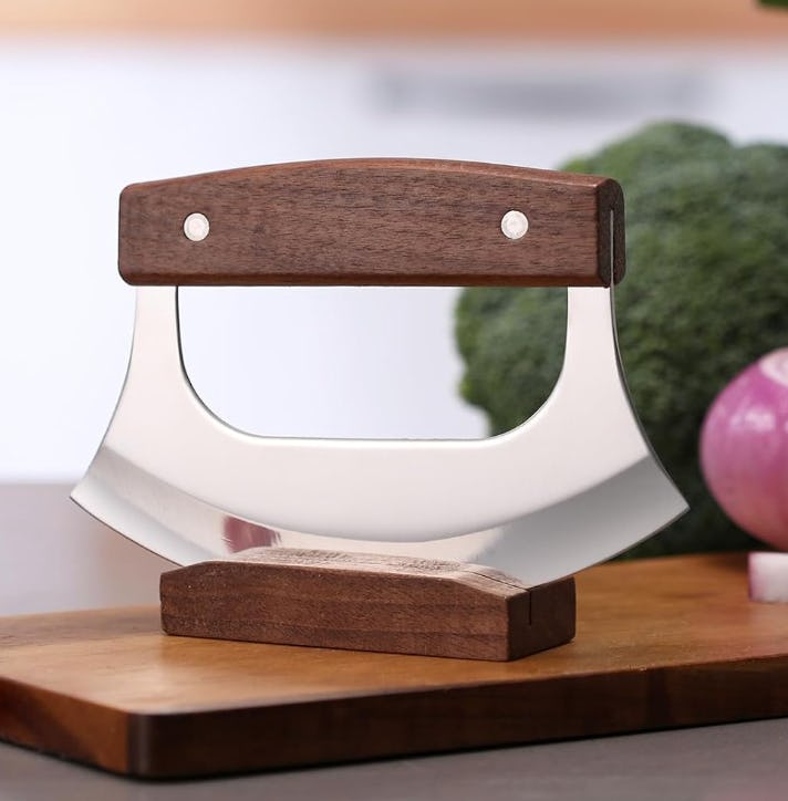 A sharp rocker mezzaluna knife with a wooden handle & holder