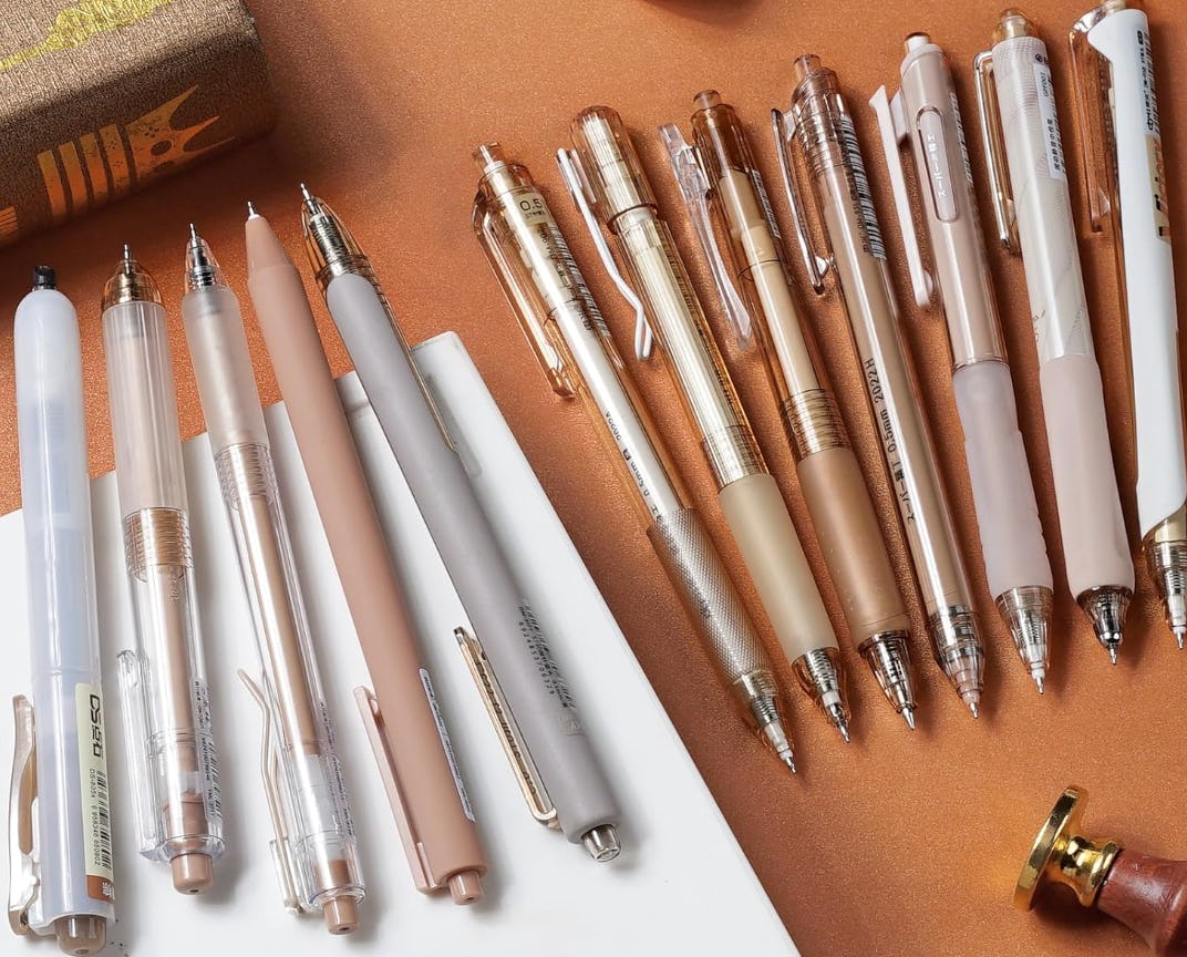 Amazon -Instead of mix-matched or boring stationery, these gel pens come in a pack featuring various styles and aesthetic colors that coordinate with each other for a cohesive look. They feature ribbed, tapered, or cushioned barrels to reduce hand fatigue and quick-drying ink to prevent smudging. This set includes 12 pens — 10 black ink, one brown ink, and one highlighter.