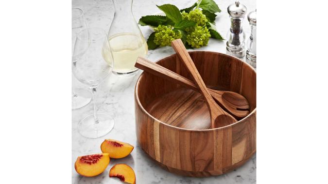 Serve up your favorite salad in an elegant acacia wood salad bowl. Each bowl comes with a set of salad servers and even acts as an attractive dining room table centerpiece when not in use.