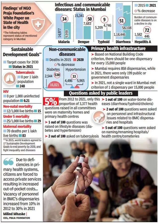 "These shortages exist despite an increase of 196% in the BMC's health budget from 2012-13 to 2022-23," said Praja CEO Milind Mhaske. The NGO has analysed that the island city with a 27% slum population needs 133 more dispensaries, while western suburbs with 43% slum population need more 315 centres. The eastern suburbs with 51% slum population need about 211 more dispensaries. The lack of an adequate primary health system is not only pushing out-of-pocket expenses, but could have a cascading effect on Mumbai's timeline to meet the Sustainable Development Goals (SDG) by 2030.