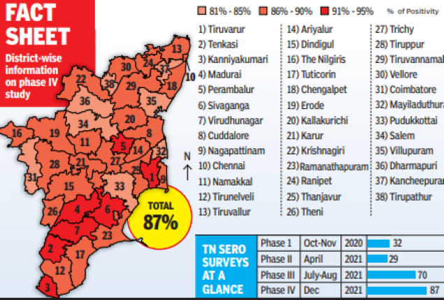 Among districts, nearly 93% of people in Tiruvarur and 92% of people in Tenkasi carried antibodies. Seven other districts -Perambalur, Madurai, Sivaganga, Kanyakumari, Virudhunagar, Cuddalore, and Nagapattinam -had antibodies above 90%, while Tirupathur (82%) and Kancheepuram (83%) had the least. While Madurai had seropositivity of 91%, Chennai reported 88% positivity and Coimbatore reported 85%.