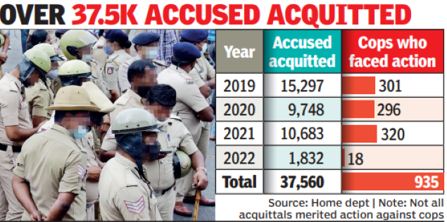 DG&IGP Praveen Sood told TOI: "We began investigating acquittals only five years ago and formed probe committees at the district, range and state levels. There may be a lot of cases where the accused are acquitted, but not all of them are due to poor prosecution. Where acts of omission and commission are found, we do take action. Some instances merit just a warning."