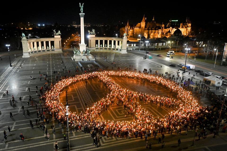 TOPSHOT - Protestors against the war and Russian invasion of Ukraine form the peace symbol during a demonstration at Heroes' Square in central Budapest, on March 9, 2022. (Photo by Attila KISBENEDEK / AFP) (Photo by ATTILA KISBENEDEK/AFP via Getty Images) AFP via Getty Images