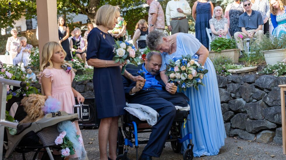 It took six people to lift Watts into a wheelchair and roll him down a ramp into the couple’s sun-dappled backyard in a suburb of Portland, Oregon, where the couple now live. Gustavson came next. After all this time, Gustavson wanted it done the right way — so the groom hadn’t seen her in the blue dress.