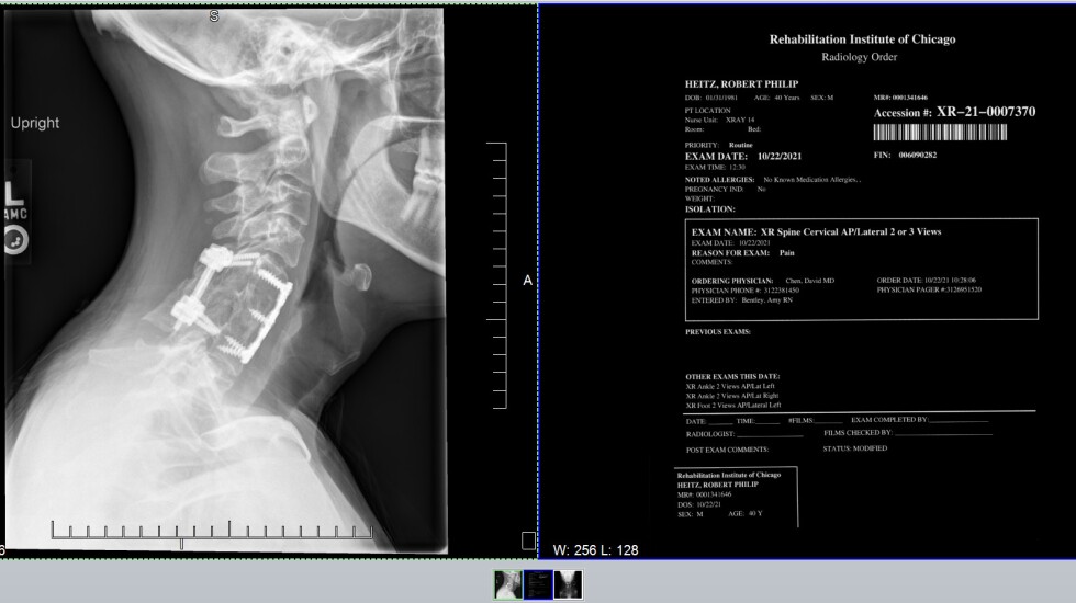 Heitz’s father, then a personal injury attorney, quickly found a specialist at Northwestern Memorial Hospital. The impact from the dive had shattered one of the vertebrae in Heitz’s neck. The spinal cord had been damaged but not severed. Surgeons fashioned a vertebra from a piece of Heitz’s hipbone and fused two other vertebrae together. Titanium plates and screws hold it all together.