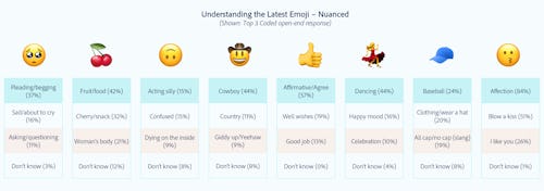 Other findings are more out there. Apparently, the cowboy hat face emoji 🤠 is one of the most misunderstood emoji in circulation due to the nuanced nature of its current meaning. The cowboy has shifted from “Yeehaw” (I’m joyfully herding cattle) to “Yeehaw” (I’m angry/sad, but keeping my hat on, so to speak). According to the report, 44 percent of responders thought it represented a cowboy, while none identified the newer, nuanced meaning. Adobe found similar issues with the cherries 🍒, kissing face 😗, and billed cap 🧢 emoji as well.