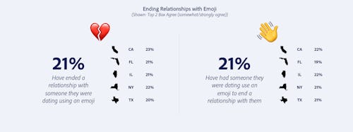 The strangest finding, though, has to be the statistics Adobe compiled on emoji use in dating. Obviously, Adobe found that using an eggplant emoji 🍆 on dating apps makes you less likable. No, I’m talking about the 21 percent of people Adobe found that ended a relationship with an emoji. What the hell!?