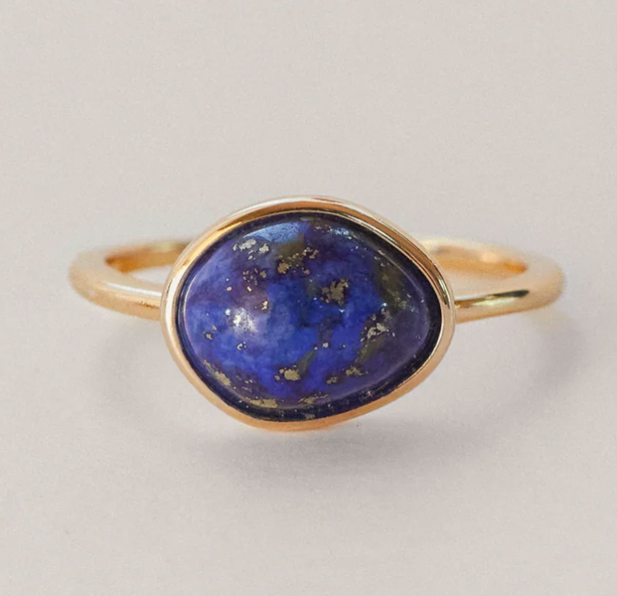 The hero feature of this ring: stunning deep blue lapis lazuli, inspired by the color of the California ocean. Organically shaped, the stone is set in a band crafted from sterling silver thickly layered with 14-karat gold vermeil. A luxe piece anyone would keep forever, this will look incredible whether worn singly or stacked — so it’ll work for both minimalists and maximalists.