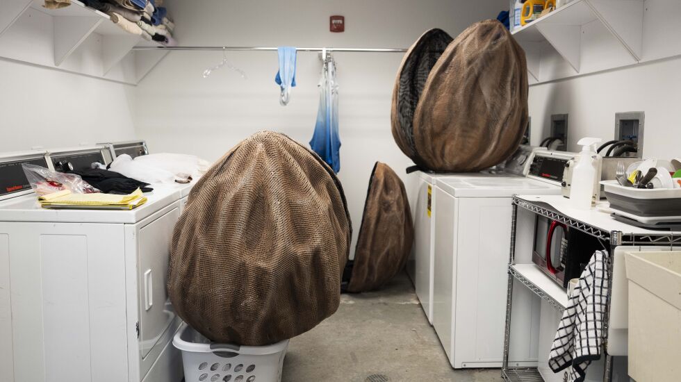 In an adjoining room, objects that bring to mind the leathery eggs from the 1979 movie “Alien” sit scattered about the costume shop’s laundry room. They’re actually the ballet’s giant walnuts, and child actors will be enclosed in them from head to waist during the World’s Fair scene in the show. When this version of the show opened in 2016, they were made of papier-mâché.
