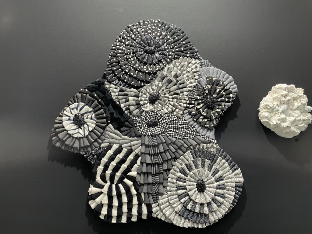 Measuring around two square metres, the piece is made up of tiny, folded pieces of blue and grey denim, cut from old jeans and stitched together to form patterns that fan out in a spiral.