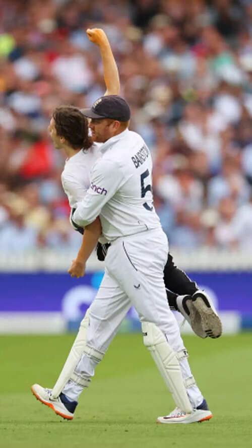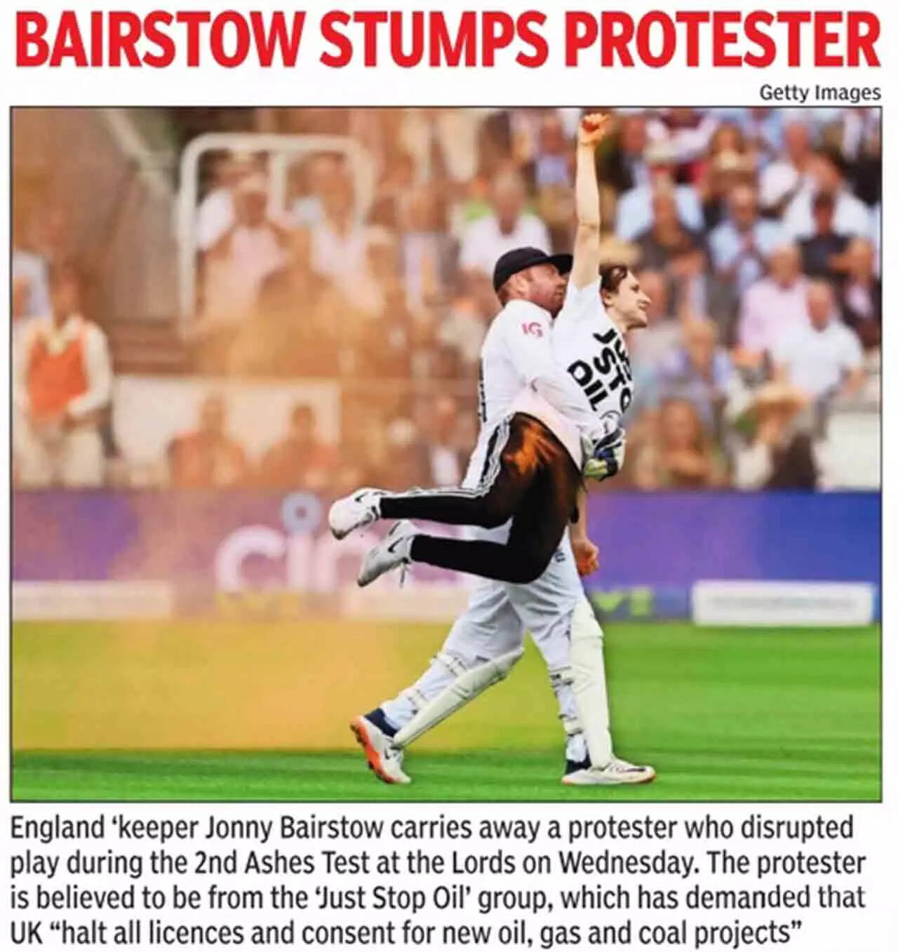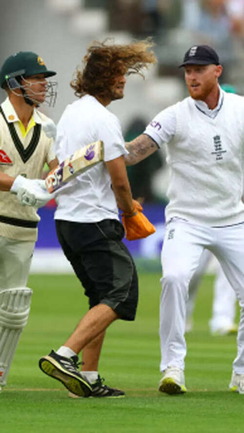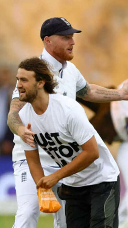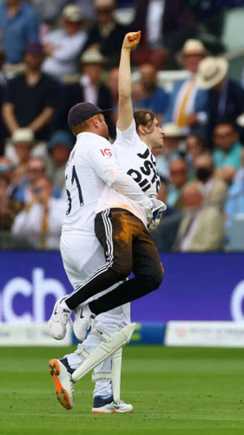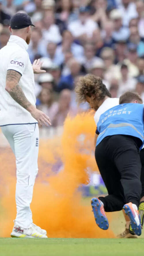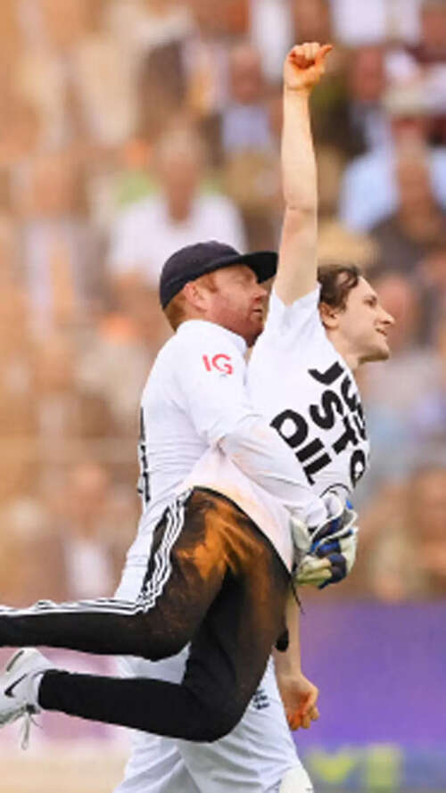 Play was interrupted as the climate protesters tried to spray orange powder on the pitch but were foiled by Jonny Bairstow who got the better of one of the two protesters. The England batter hoisted the invader - who was shouting all along - on his back and deposited him like a sack of bananas to the security near the square leg boundary. The other demonstrator was dealt with by England captain Ben Stokes and Australian opener David Warner, rivals momentarily united by a common cause.